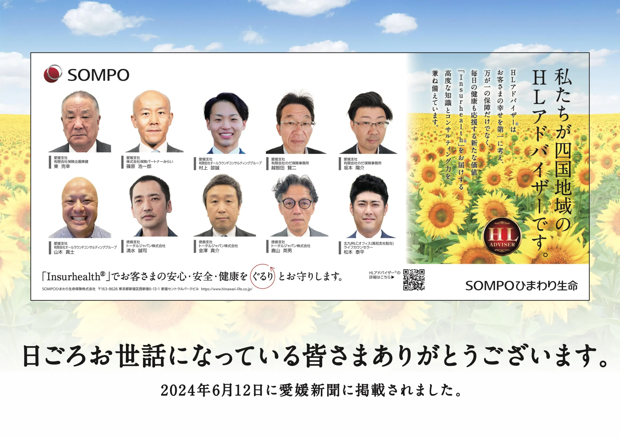 この度、山本真士と村上諒誠の2名がSOMPOひまわり生命保険株式会社のHLアドバイザーとして、2024年6月12日の愛媛新聞に掲載されました。