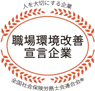 この度、労働社会保険諸法令の遵守や職場環境の改善に積極的に取り組み、企業経営の健全化を進める企業として、全国社会保険労務士会連合会より「職場環境宣言企業」の認証を受けました。